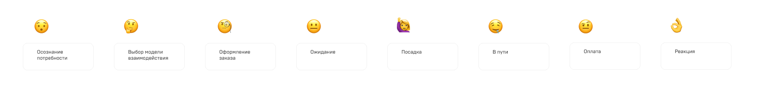 Разбиваем путь на шаги. Помним, что сценарий использования начинается до и заканчивается после непосредственного взаимодействия с интерфейсом сервиса. Вот какие шаги мы выделили для пользователя Яндекс.Такси: