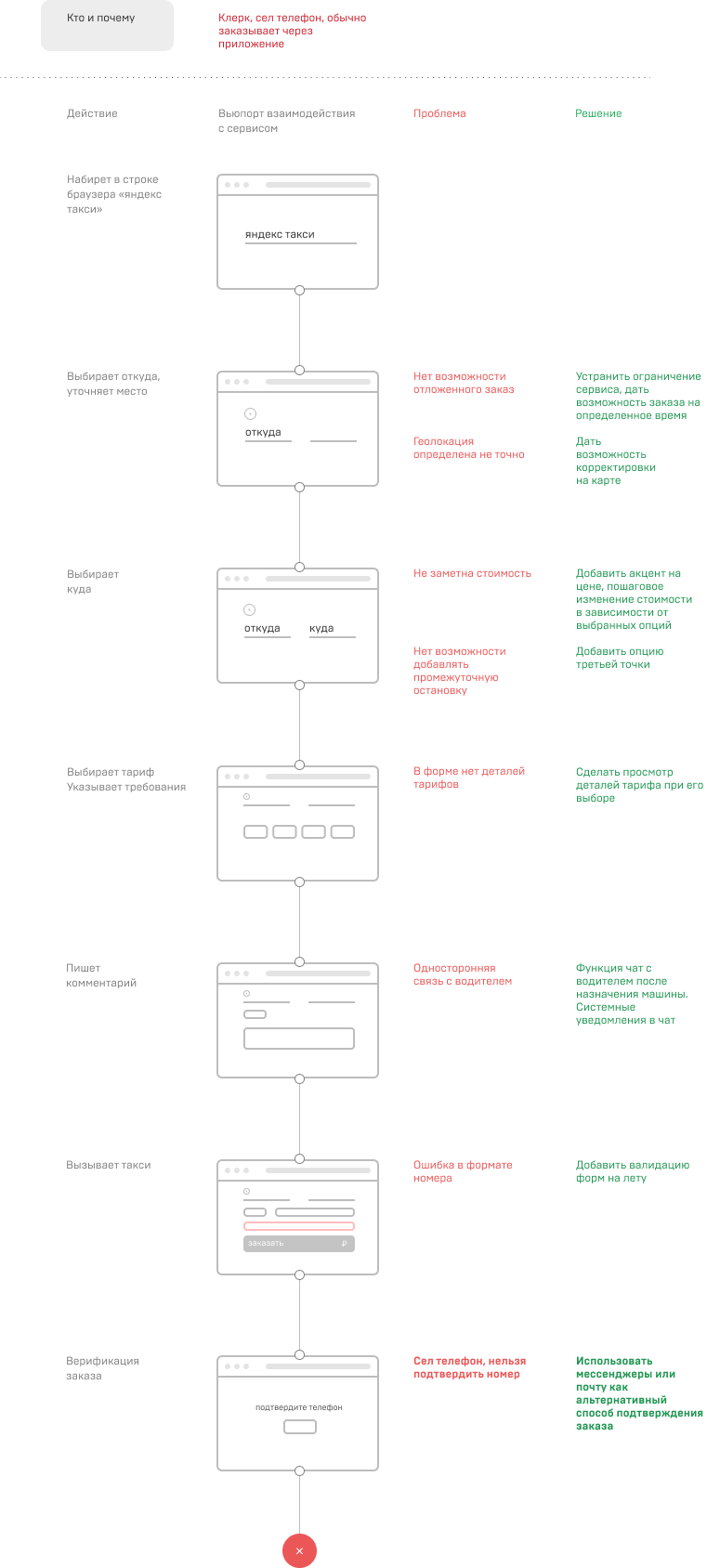 Описываем все пользовательские сценарии и все точки преткновения для каждого пользователя по схеме: действие — точка взаимодействия с сервисом — проблема — решение. На этом этапе стало понятно, что многие их пользовательских сценариев не могут быть реализованы в текущей веб-версии: наши герои не закажут такси!